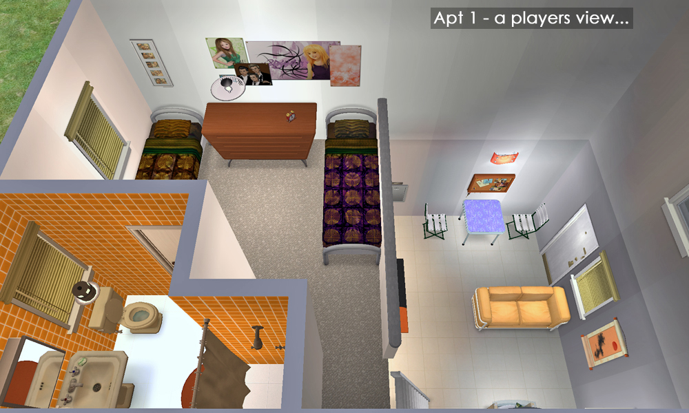 These apartments were built for Gummilutt's Apartment Mania contest. I was one of the Judges. And let me tell you, that's a very difficult job! There were some absolutely amazing builders competing! After judging round #2 - the "cheap living" round - I was inspired to try my hand at building a low-cost apartment. It's not as easy as one would expect - to make a livable place for 2 roommates, with enough space to maneuver without too many stompies, and yet be something close to what we'd expect to see in Real Life - all for less than $1000 rent. I wanted to do it CC free, but I couldn't get the rent low enough with the in-game stairs - so Marvine's ladder is included. Well that, and I really wanted a "loft". I suppose if I threw out the loft idea, a single story would have been cheaper. But, I wanted a loft, dagnabbit!