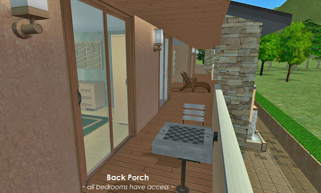 Smoke alarms are over the kitchen stove, living room fireplace, and patio grill. There are two wall telephones - one in the upper hall, and one in the lower hall. There is a burglar alarm by the front door. Decorations and furniture are included (there is plenty of room to add more, I did not over-decorate!) I used mostly the furniture from the Glamour Life SP - feel free to change things around to suite the needs/tastes of your sims.